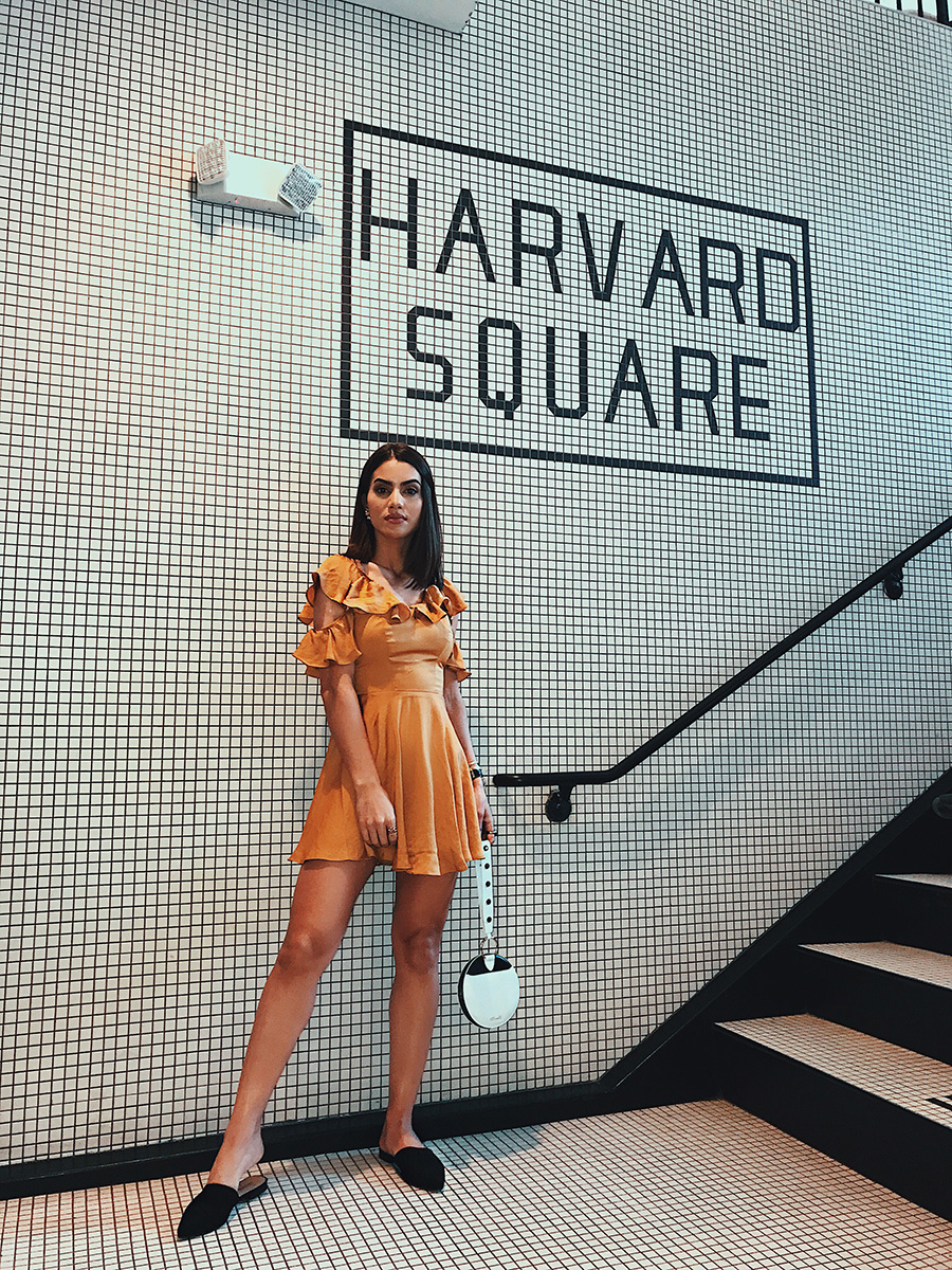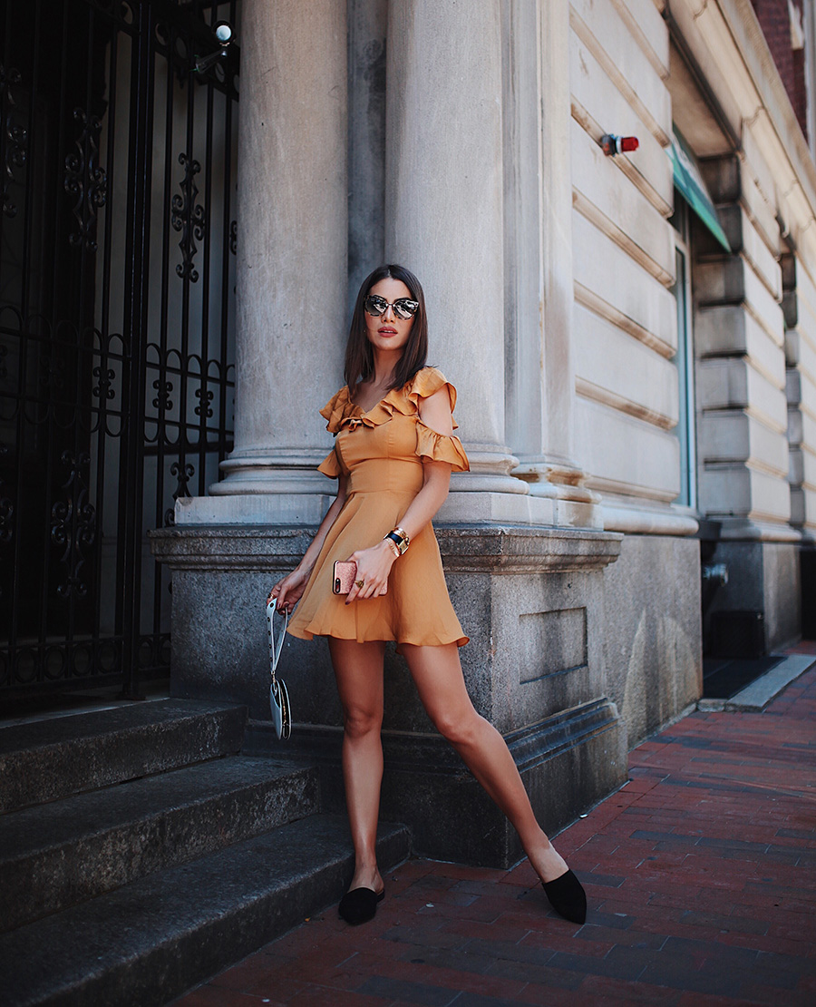Para um dia delicioso de primavera em Boston, escolhi um vestido mini, em seda, bem a minha cara – rodadinho e com babados! Combinei com uma flat mule (mega confortável) e finalizei com uma bolsa branca e acessórios em dourado! Olhem só: