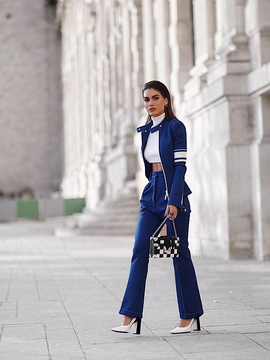 Para assistir o desfile usei um look da coleção Fall-Winter da marca, que já está nas lojas. Um conjunto azul bic de calça flare e cintura alta – que super valoriza o corpo – e jaqueta que deixou com uma vibe mais esportiva. Combinei com um top cropped com gola alta, que deu sensualidade ao look, sapato branco e bolsa PB, que também tem segue essa linha esportiva – tendência que apareceu muito nessas últimas coleções. Para a beleza apostei em um cabelo molhado penteado para trás, que deu mais força para o visual e uma make neutra. Olhem só: