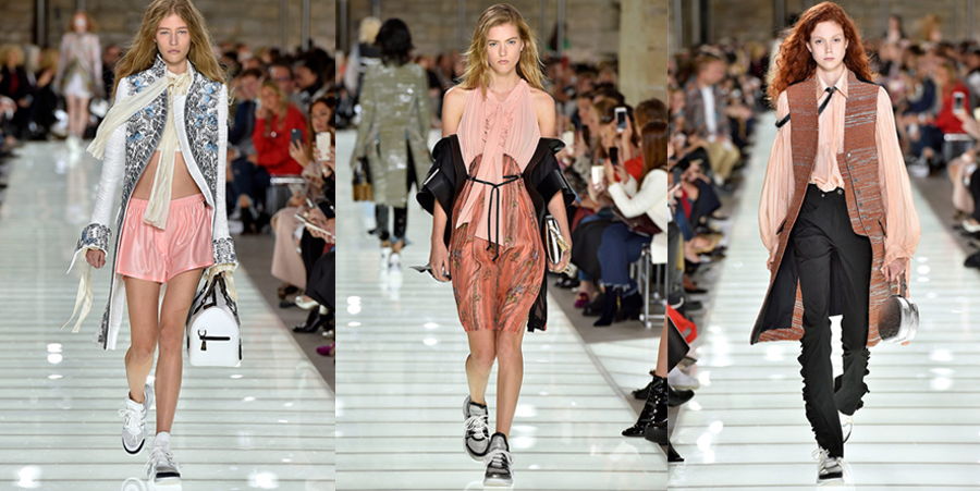 O desfile como sempre foi incrível, as modelos usavam tênis esportivos combinados com vestidos fluídos, shorts pastel ou casacos vitorianos ornamentados por brocados a la Maria Antonieta. Havia espaço ainda para um bloco de listras horizontais, total black com referência a Matrix, além de t-shirts da série Stranger Things , peças metalizadas, vinil e mini vestidos cobertos de lantejoulas e paetês. Olhem só alguns dos meus looks preferidos: