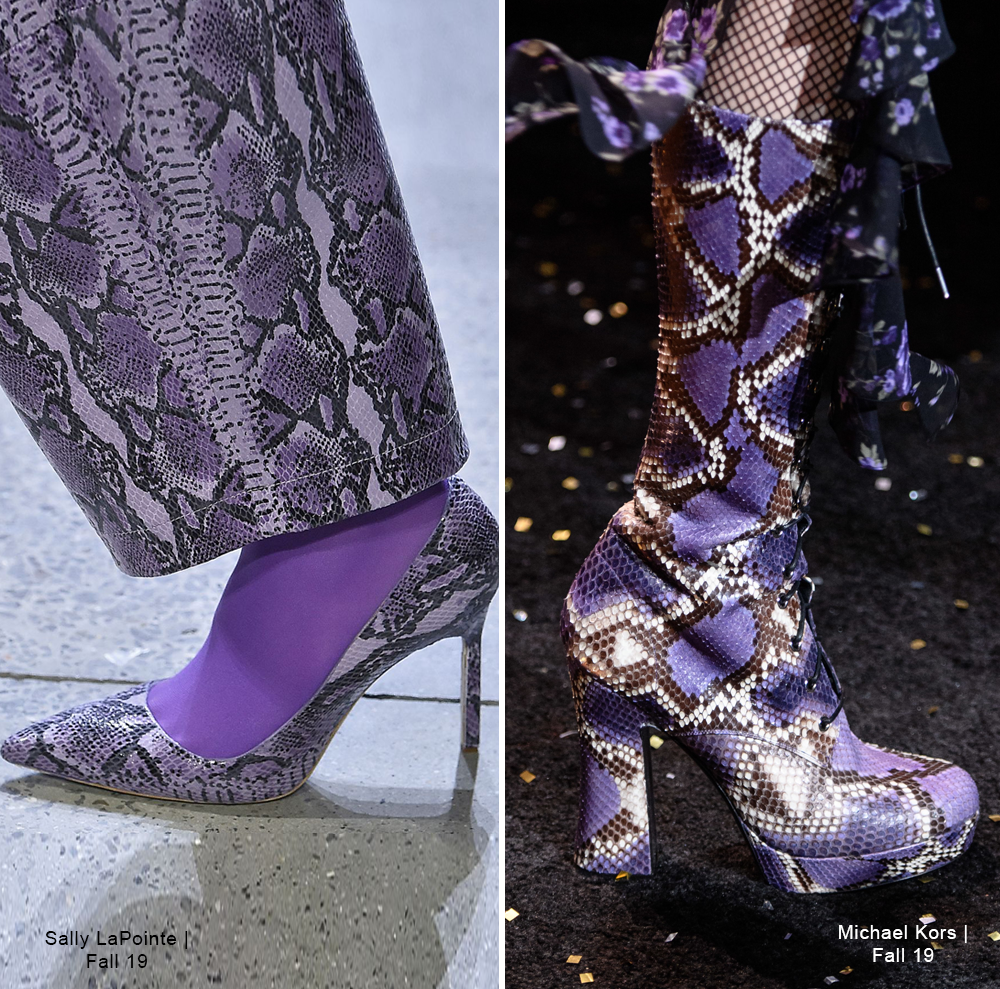 E o python não deu o ar da graça apenas na versão cinza. Sally LaPointe e Michael Kors investiram forte no mix com tonalidades da cartela lavanda, sendo um mais suave no scarpin e o outro mais vibrante na bota de cano alto. Veja como os diferentes estilos mostraram stylings interessantes com meia-calça e arrastão, respectivamente.