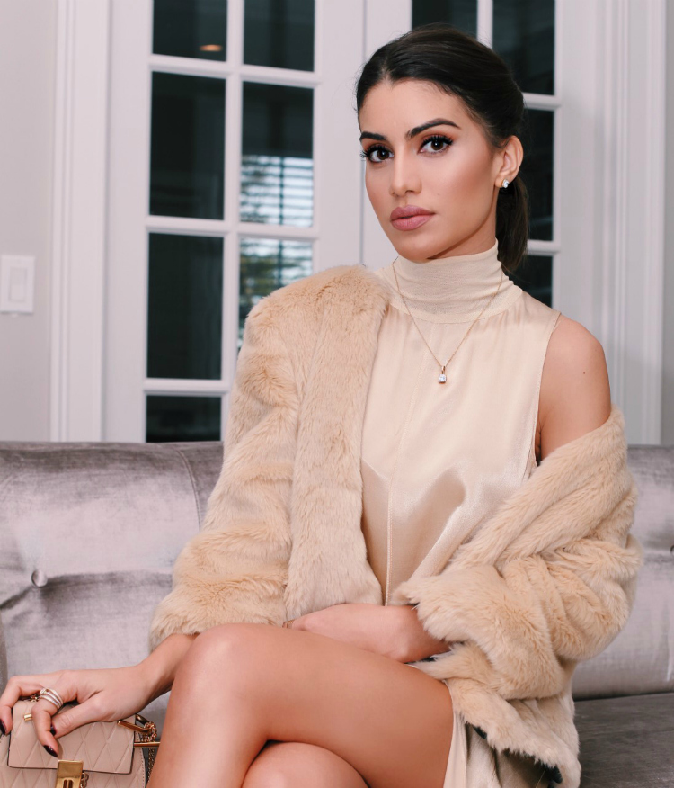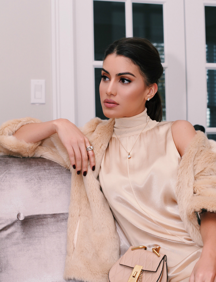 Today’s look is already on a holiday party mood, wearing all neutral with a touch a gold on the accessories! I chose a silk slip dress, which is not only chic but very comfortable, and to warm me up a faux fur coat. I finalized it with a mini nude bag and black and white mule for a more classic and modern vibe.