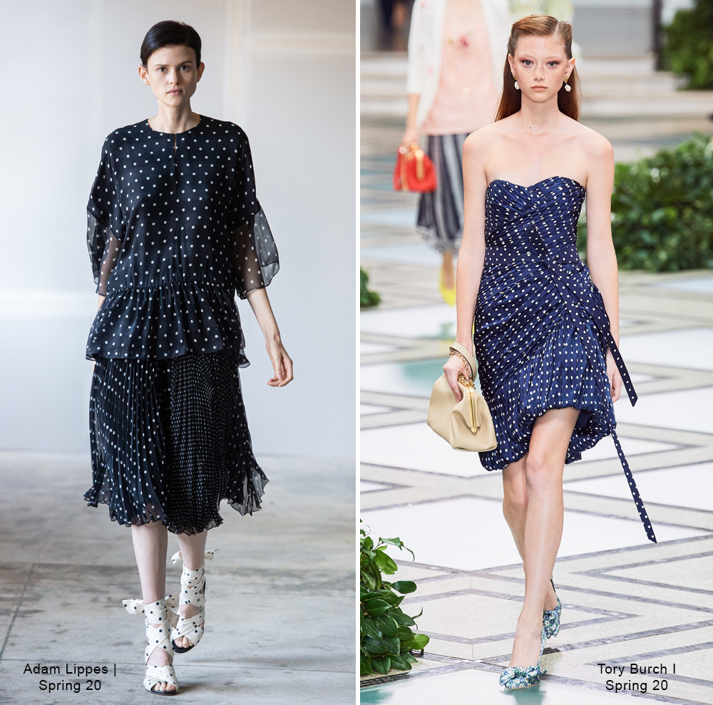 With a certain navy mood, Adam Lippes and Tory Burch bet on the navy blue background for their white polka dots. On one side, a model with a slumped waist that plays with ruffles in the skirt and ruching on the blouse. On the other, a dress with a princess neckline, discreet ballooning effect and draped throughout the piece.