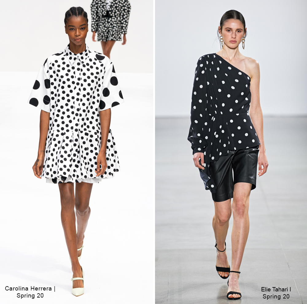 In ready to wear collections, there are options that give an even more elegant and cool tone to the polka dot. At Carolina Herrera, a variation in the ratio between the dots of the body of the dress and the sleeves create a modern, super feminine contrast. As a matter of fact, the founder of the brand, Mrs. Herrera, transformed the polka dots into one of her unmistakable DNA elements, in addition to being responsible for presenting them on her runways for past seasons – and even became an exhibition theme in São Paulo. As for Elie Tahari Summer 2020, asymmetry was the characteristic chosen to give bossa to the black and white look.