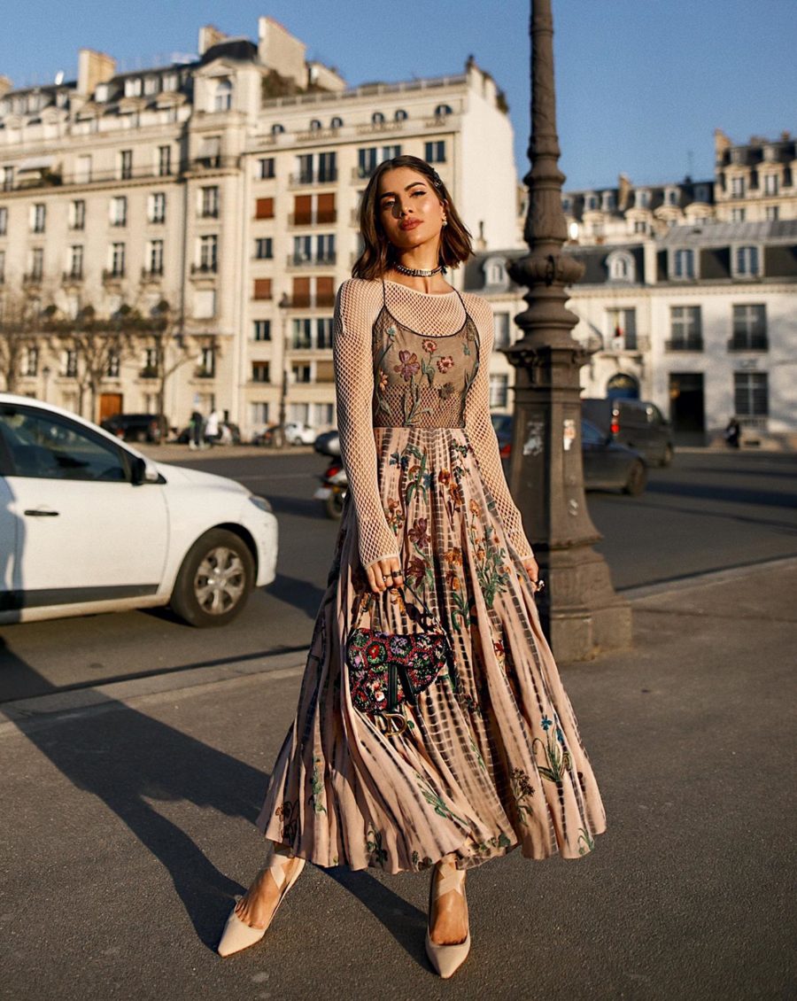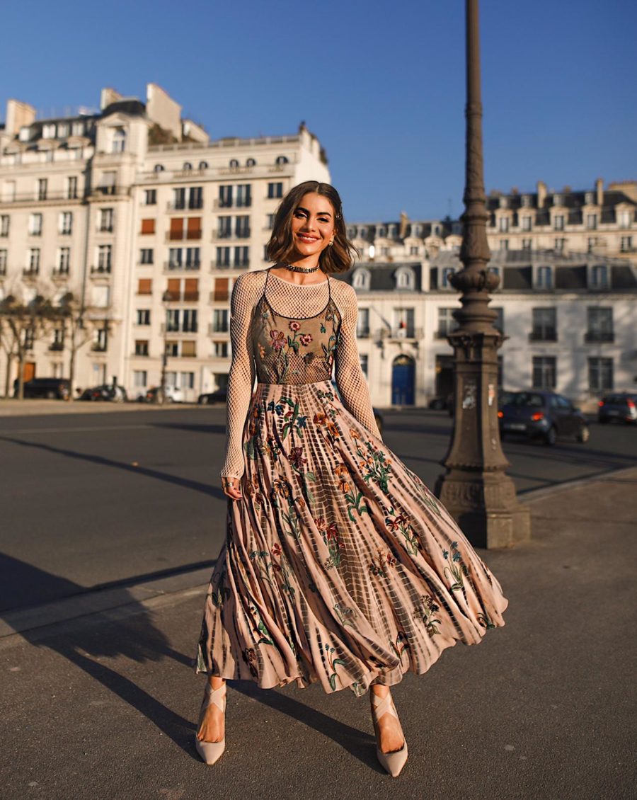 My look for this fashion season was very ballerina (from the last Cruise show). With a super feminine floral dress, and underneath a “second skin” fishnet, which was a striking piece in the last collection!