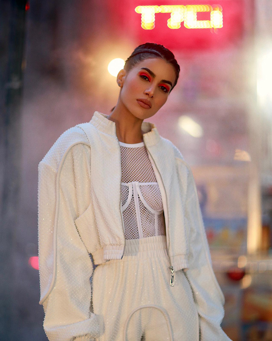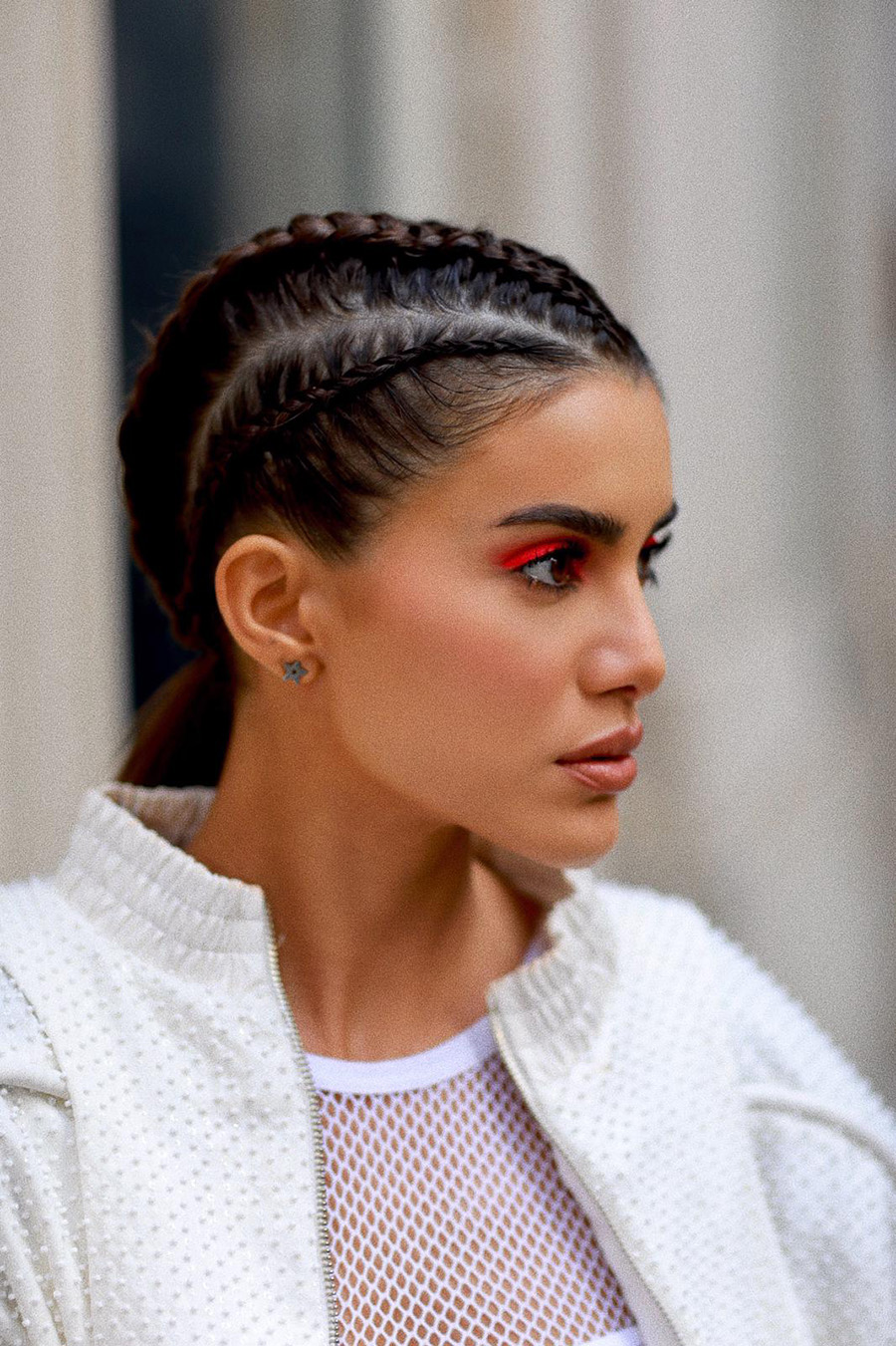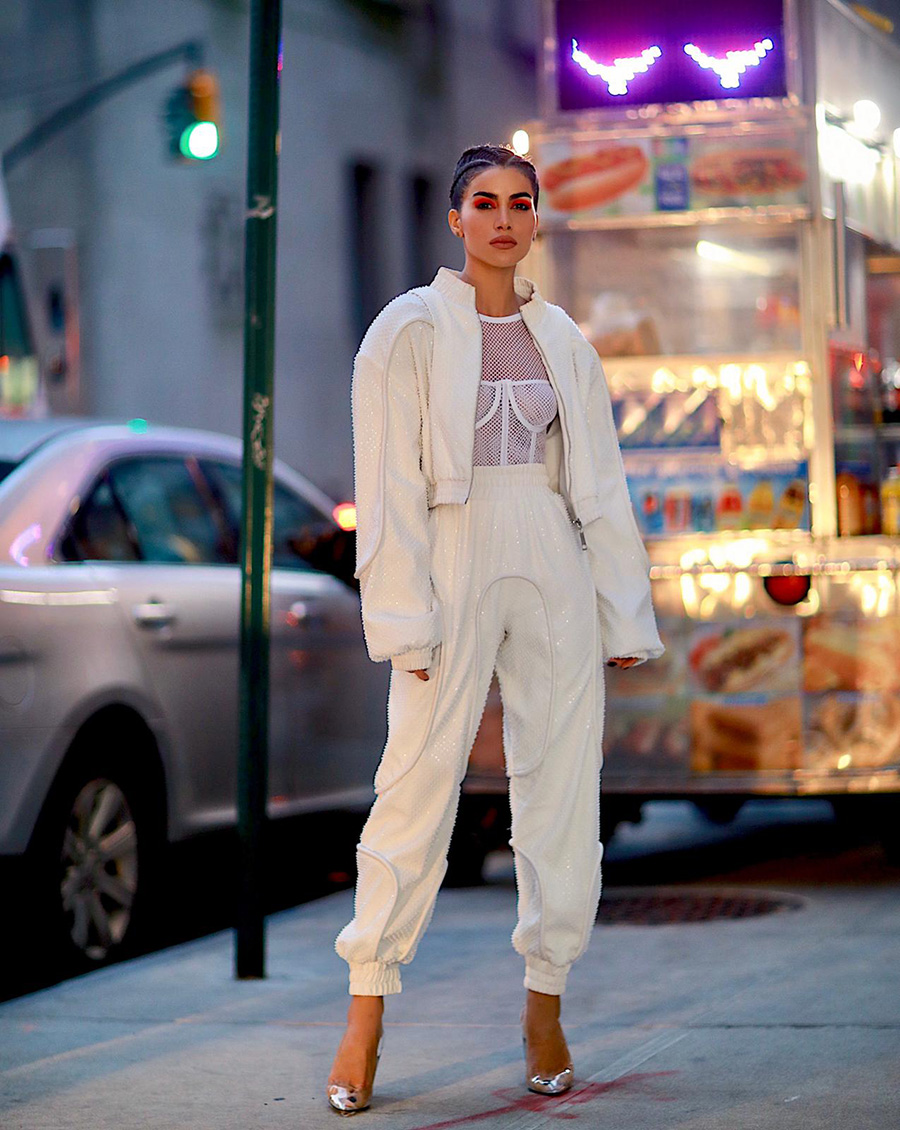 Today’s look is a combination of two trends that I LOVE – total white and sporty chic. To attend the Rosa Chá show, which inaugurated at NYFW, I chose a beautiful look by the brand, which was even shown on the catwalk – bomber jacket with a bulky shoulder and a net top underneath. To give more strength to this sport vibe, I bet on a striking makeup – braid and colored eyeshadow, which gave the look a more modern attitude!