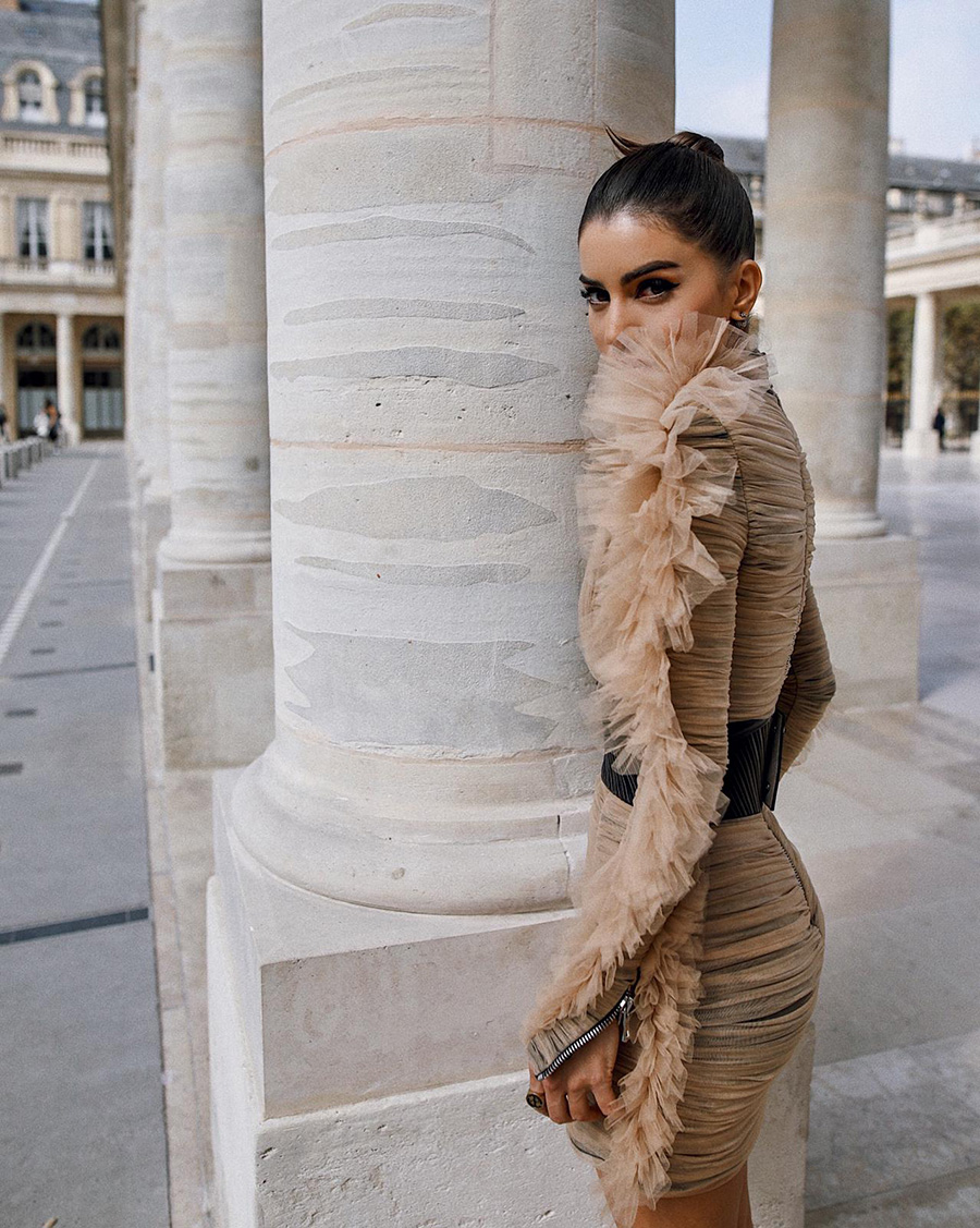 I chose a mini dress, all in Nude tulle with frills on the sleeve and hip. It was actually my favorite look from the last show I attended and I was super happy to wear it! Check it out: