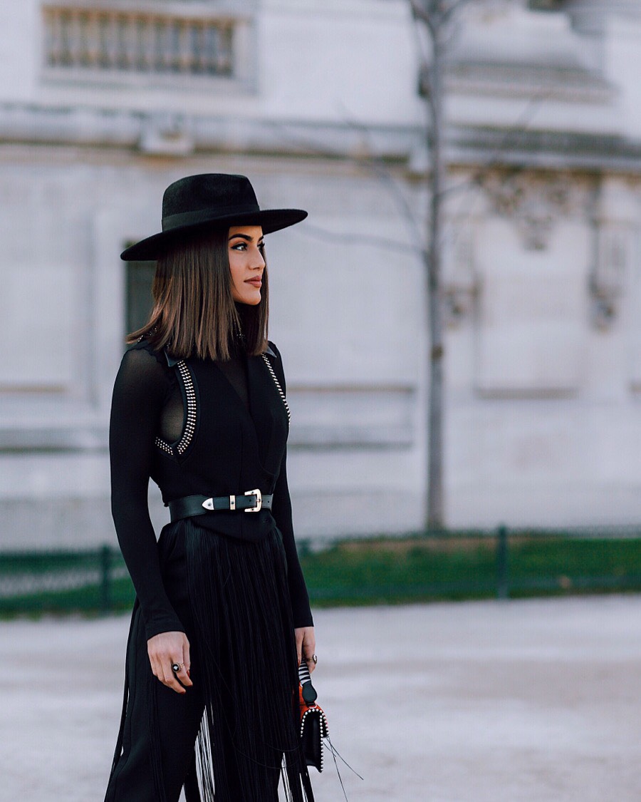 To attend the Elie Saab show at Paris Fashion Week, I put together a total black tailored look with a western touch. The thin-fringed trousers in silk threads were the highlight of the look – I wore it with a short vest and a belt around the waist, which left the look more charming and feminine. I finalized with a black hat – an accessory that completed the overall look.